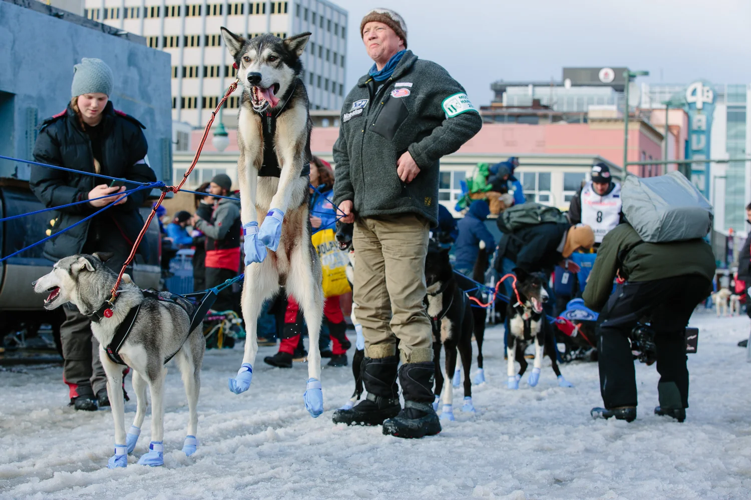 Dogs of musher Thomas Waerner of Norway (bib #8) leap excitedly in the air waiting for their turn to start down fourth avenue in downtown Anchorage Alaska on March 7, 2015.