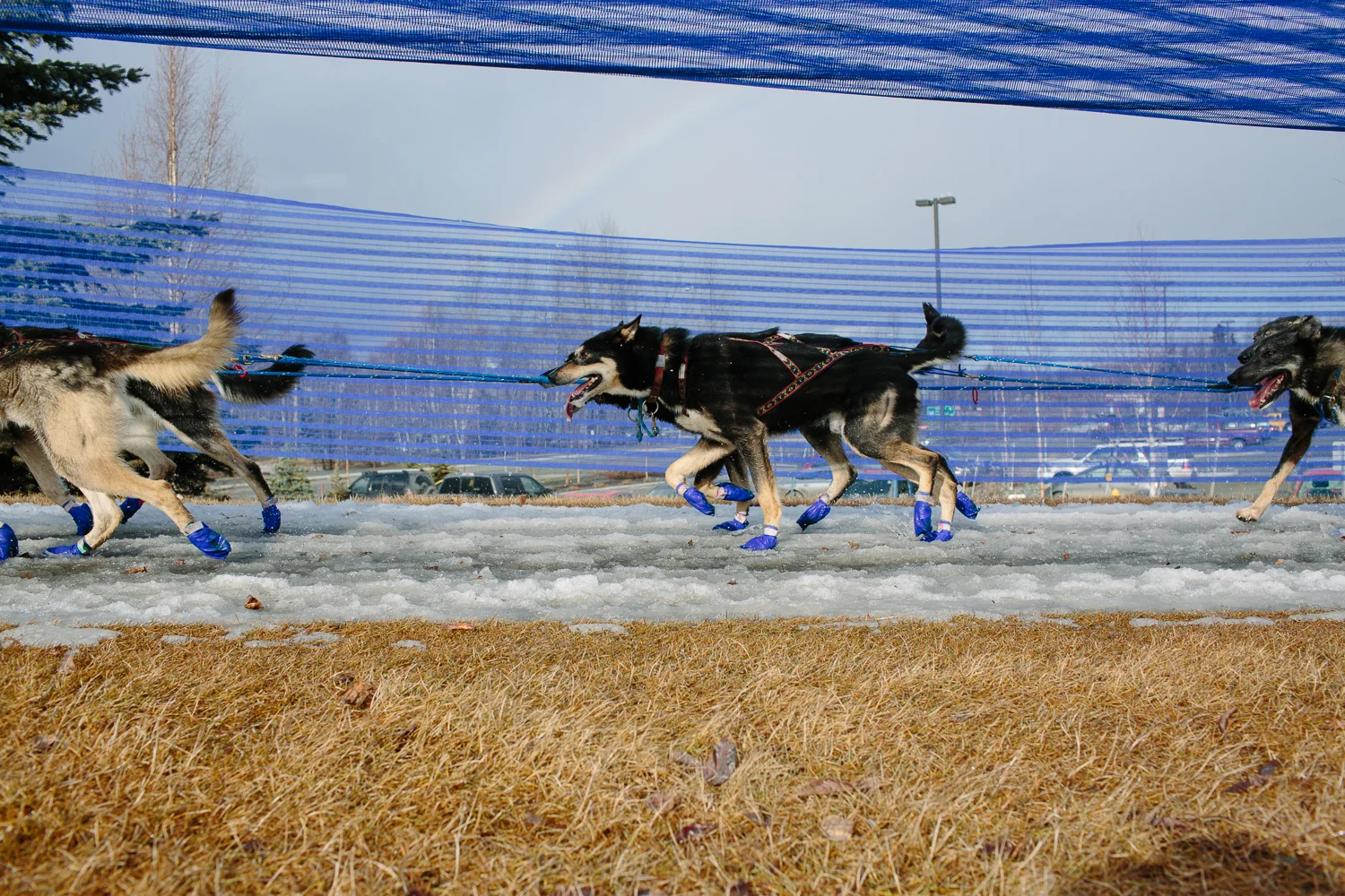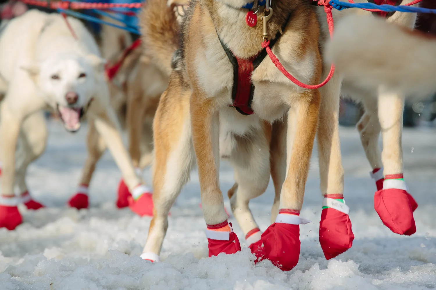 Iditarog sled dogs' paws are protected by fabric dog "booties" at the Ceremonial start of the 2015 Iditarod sled dog race in Anchorage, Alaska on March 7, 2015.