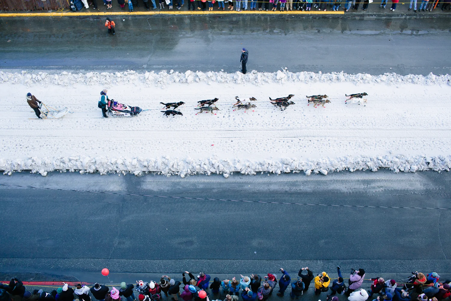 Becca Moore of Willow and her dog handler passed crowds of young people in Anchorage Alaska during the Iditarod's Ceremonial Start. March 7, 2015. Teams faced warm temperatures and lack of snow on the 11 mile ceremonial start route.