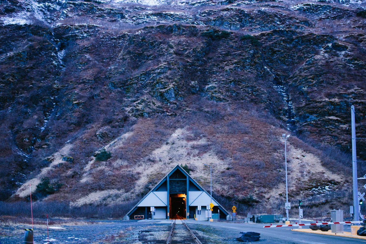 The Whittier-side entrance to the single-lane tunnel. The tunnel services both automotive and train traffic, and at 2.5 miles long is the longest highway tunnel and longest combined rail and highway use tunnel in North America. It is the first tunnel designed for -40 degrees fahrenheit temperatures and 150 mph winds, and includes jet turbine and portal fan ventilation. The vaulted roof is meant to withstand avalanches as well.