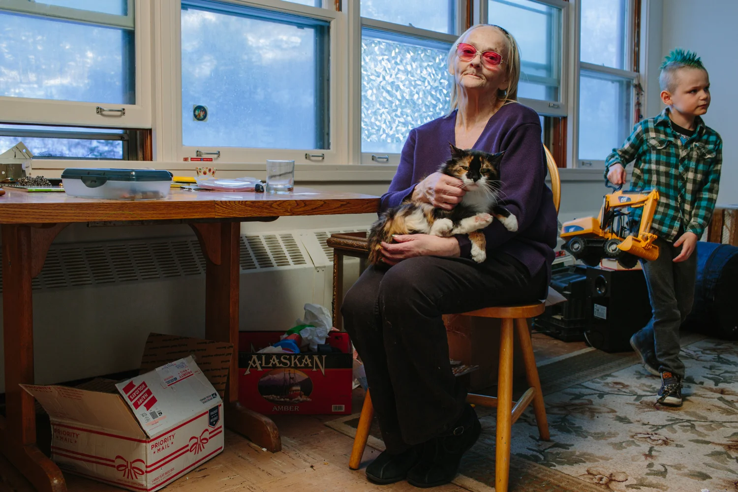Terry Bender sits in her daughter Brandi's apartment petting the family cat, Willow. Terry also lives in an apartment in the building. In the background is Terry's grandson, Chase who is the fourth generation of his family living in the Begich Tower. Terry's mother was known as the 'Matriarch of Whittier' in her day.